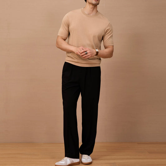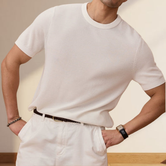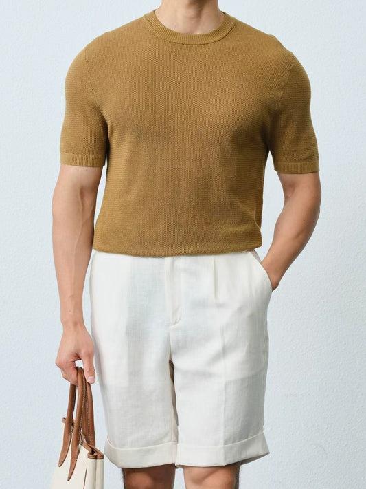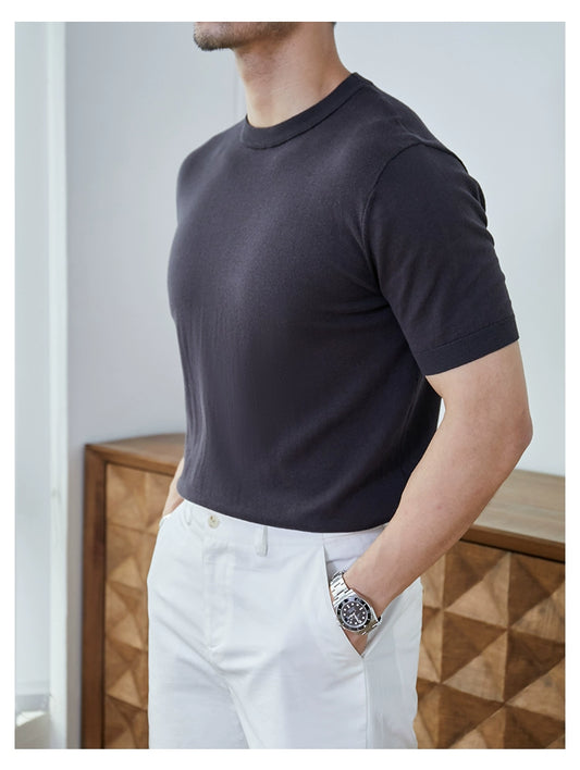 老錢風萊賽爾纖維針織短袖通勤義式復古純色圓領T恤男士