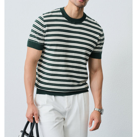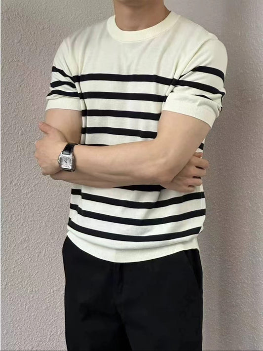 夏季經典百搭14針橫條紋短袖高級商務休閒感純棉T恤