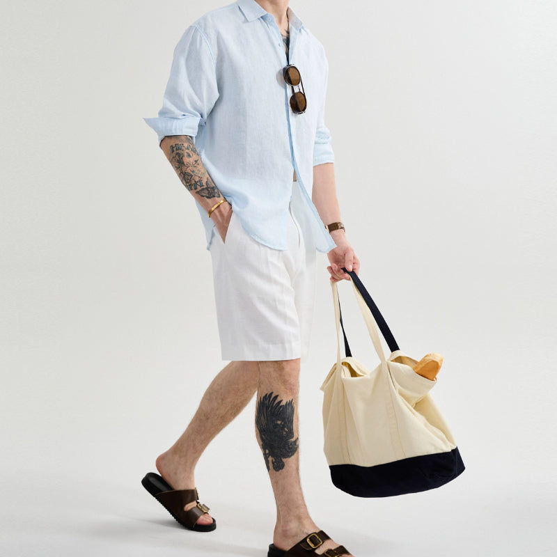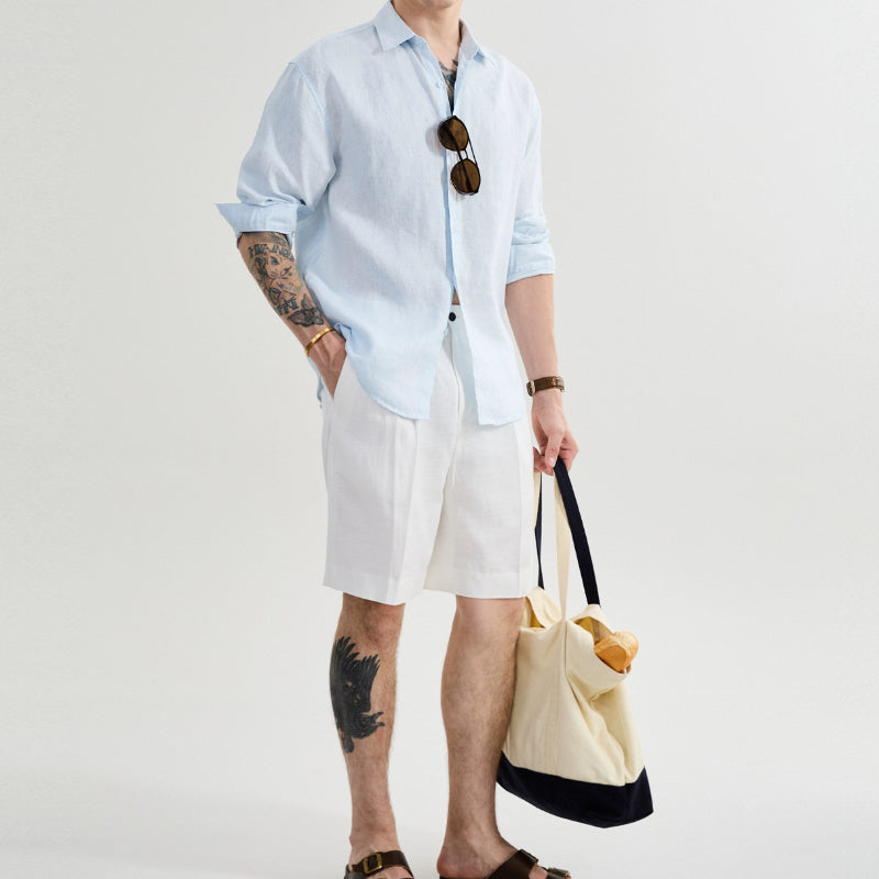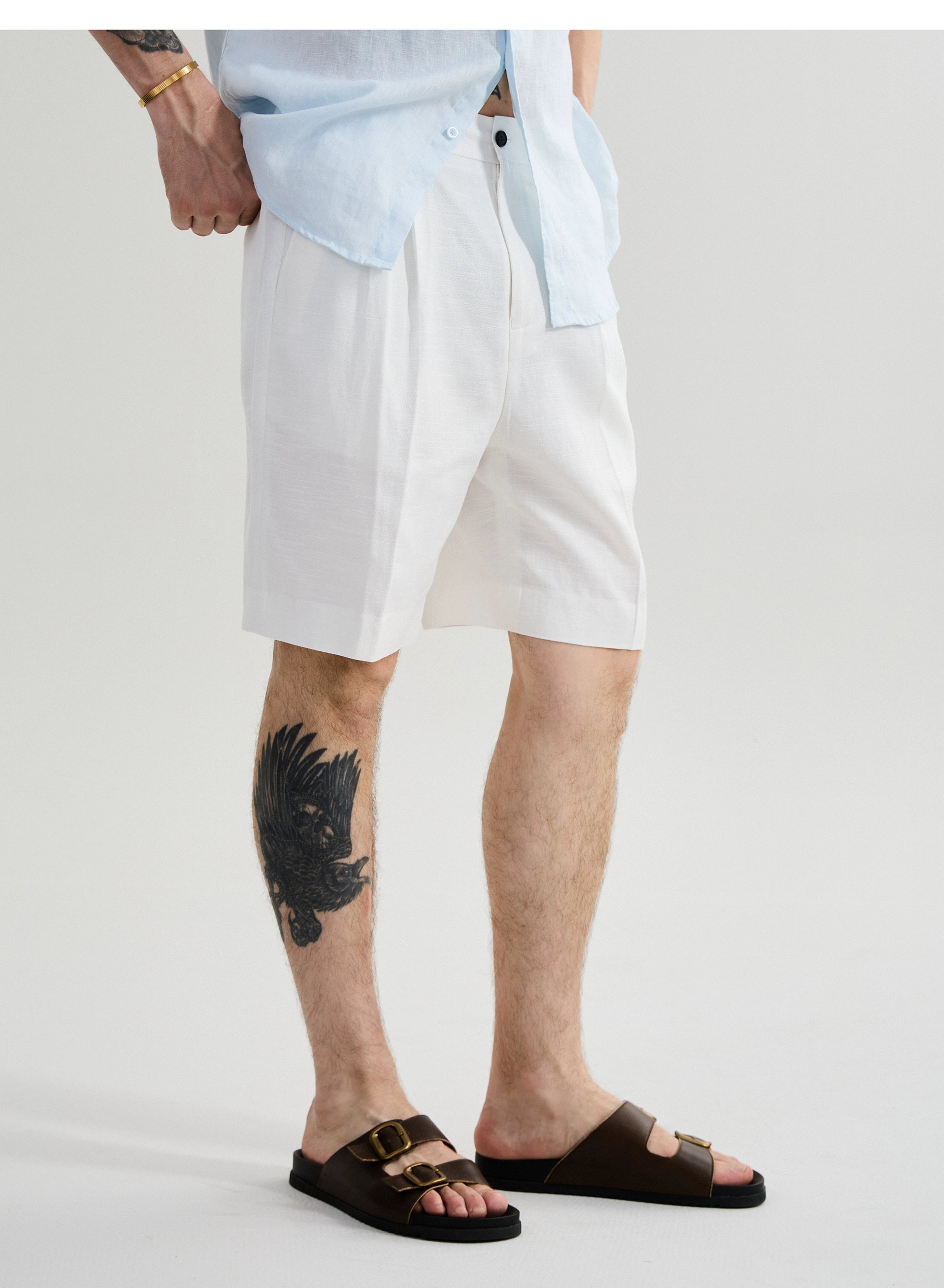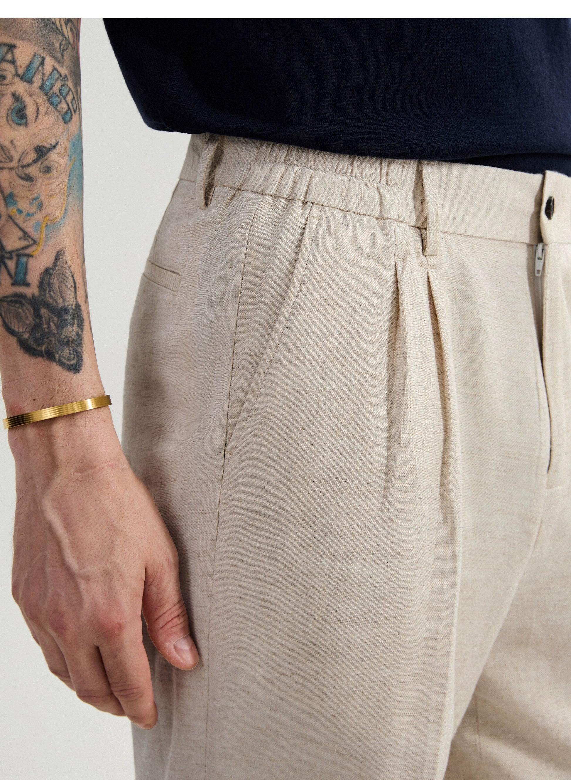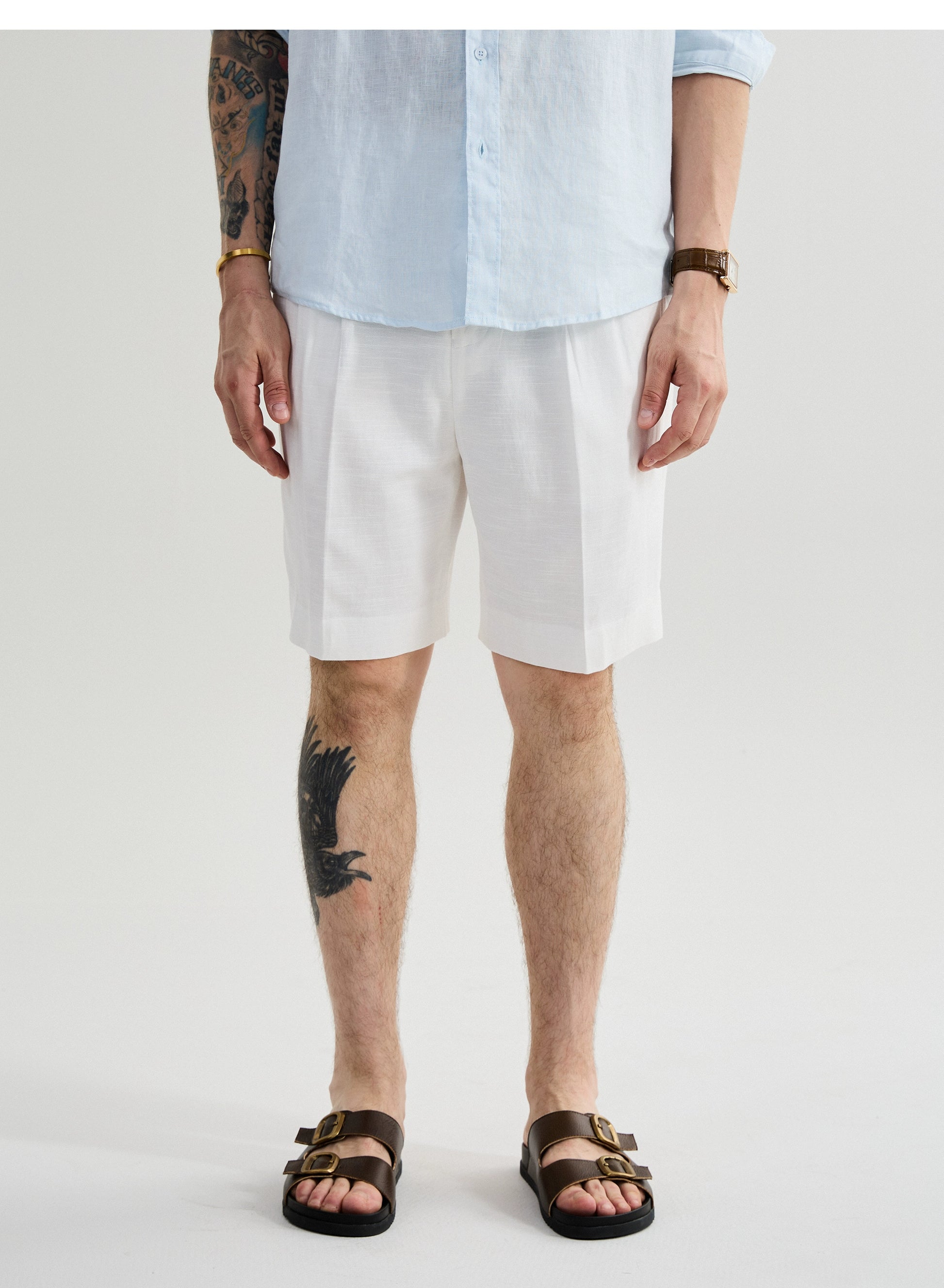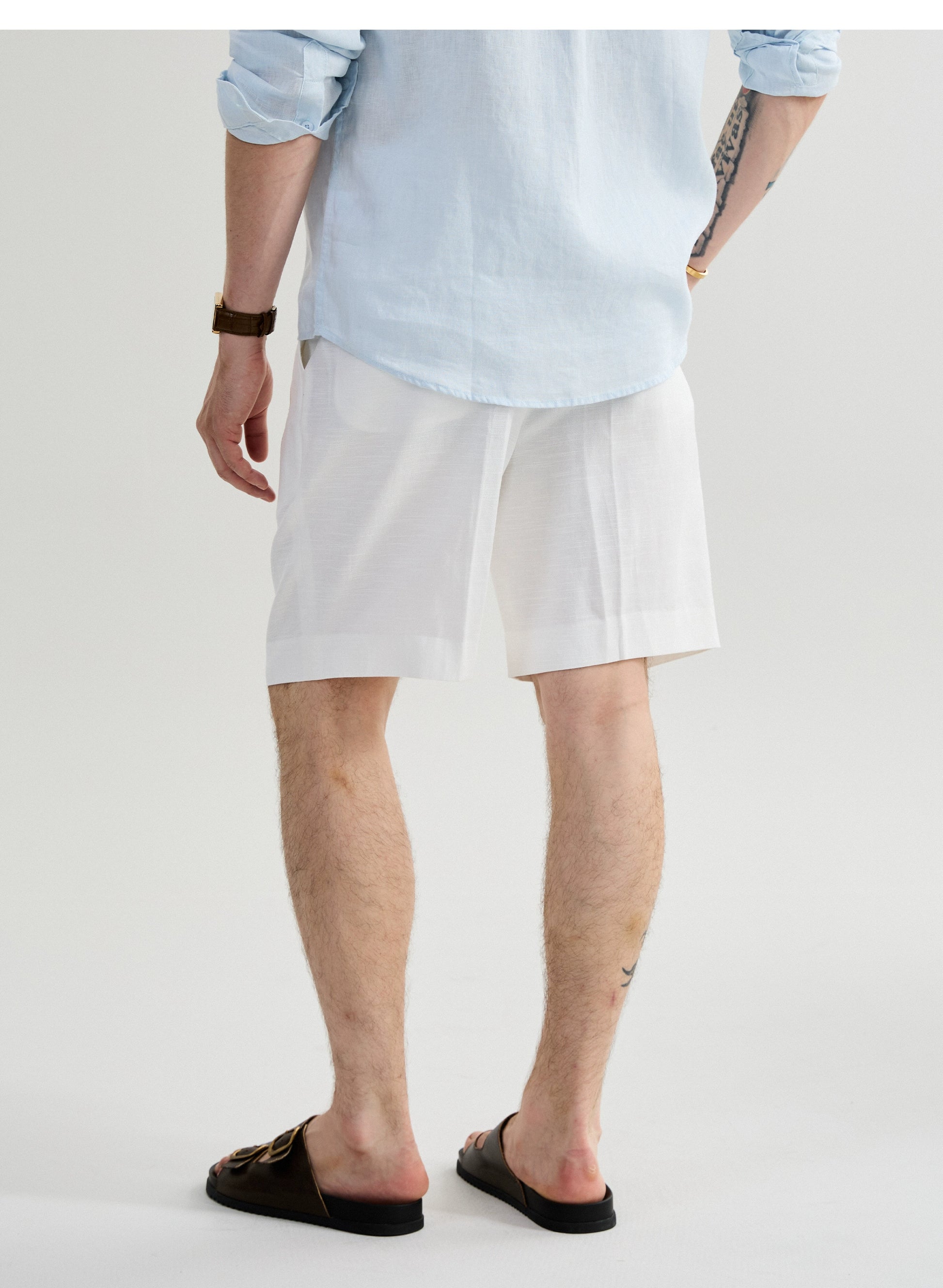 男士休閒直筒彈力腰圍亞麻混紡透氣復古百搭短褲