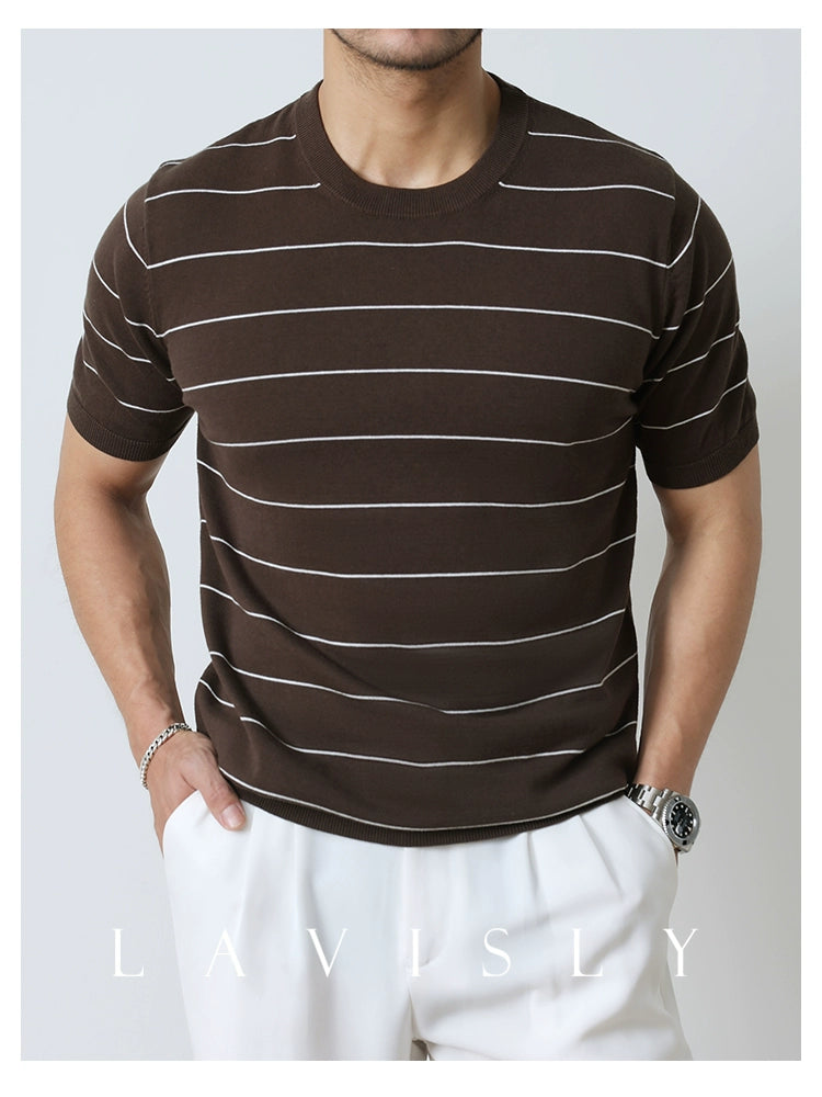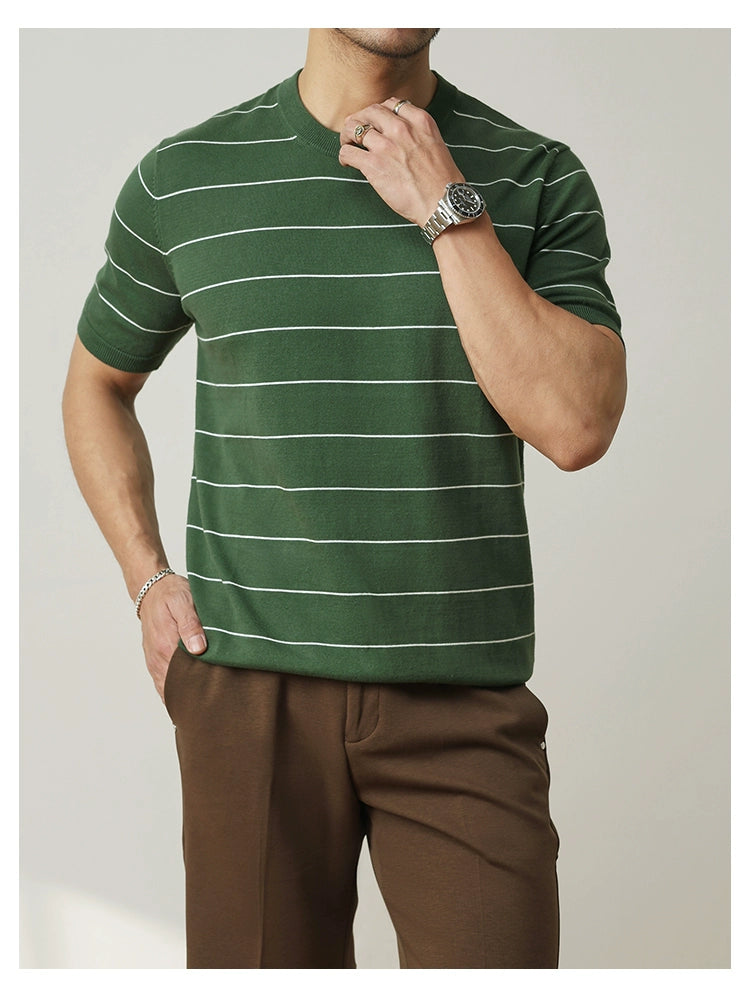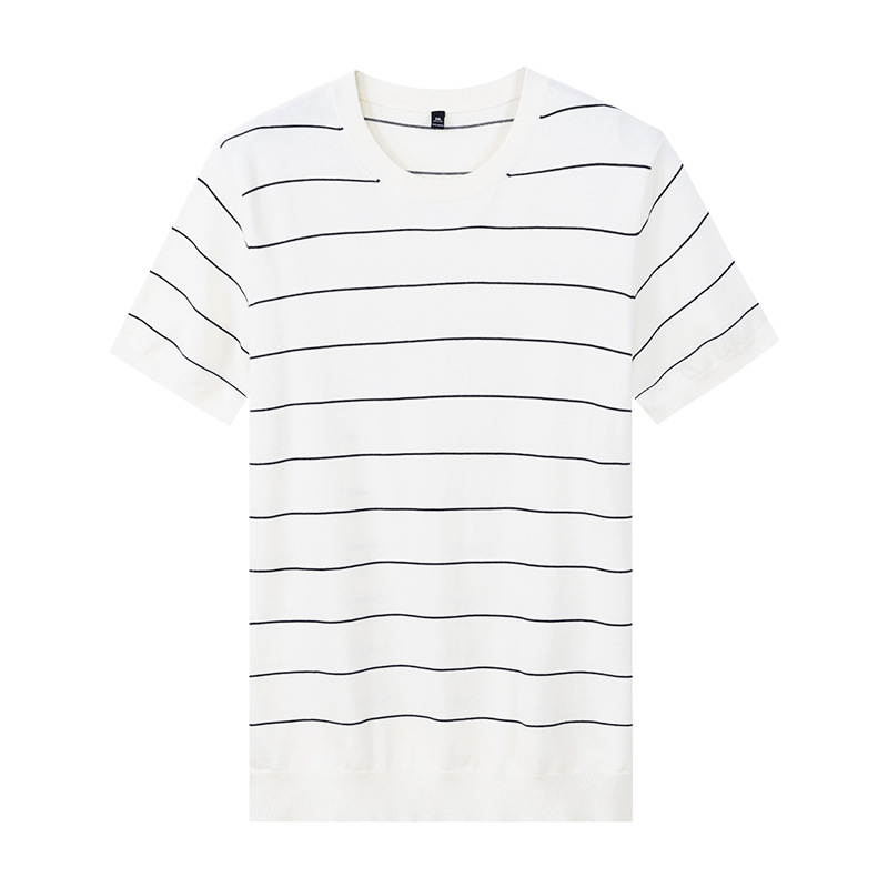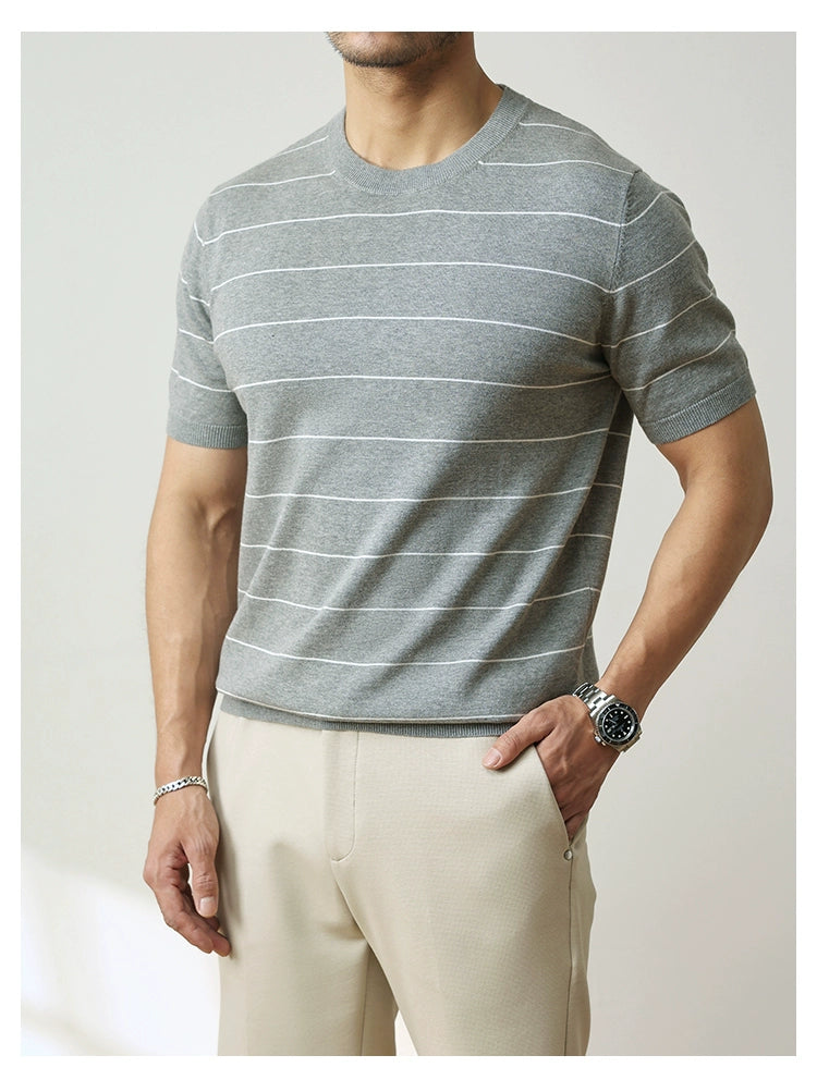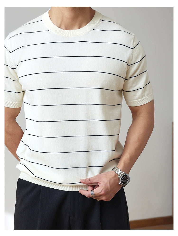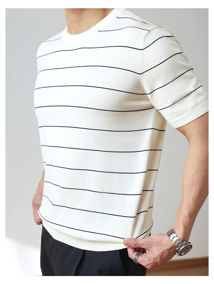 夏季經典百搭14針橫條紋短袖高級商務休閒感純棉T恤