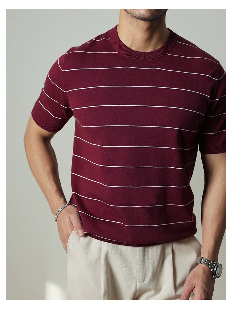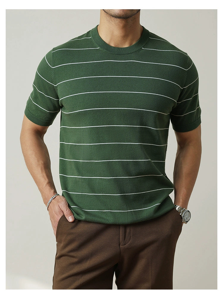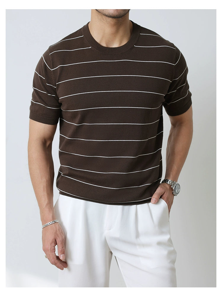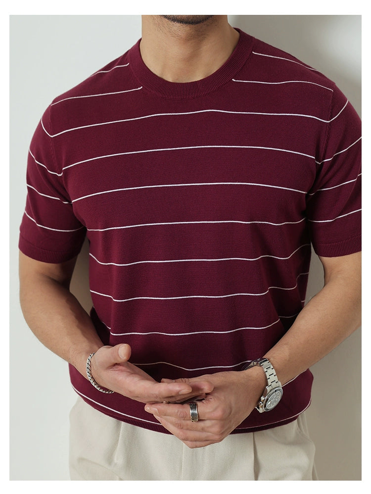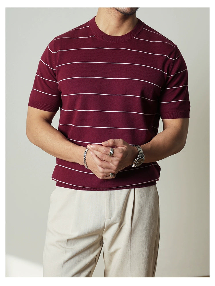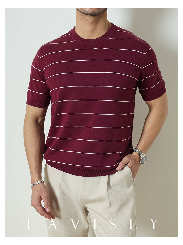 夏季經典百搭14針橫條紋短袖高級商務休閒感純棉T恤