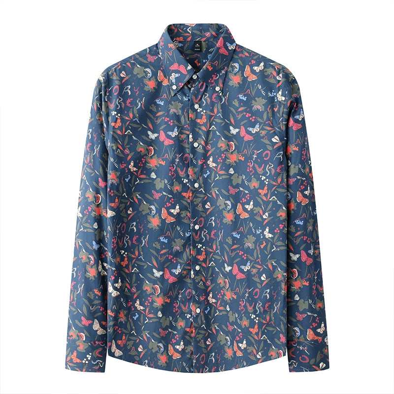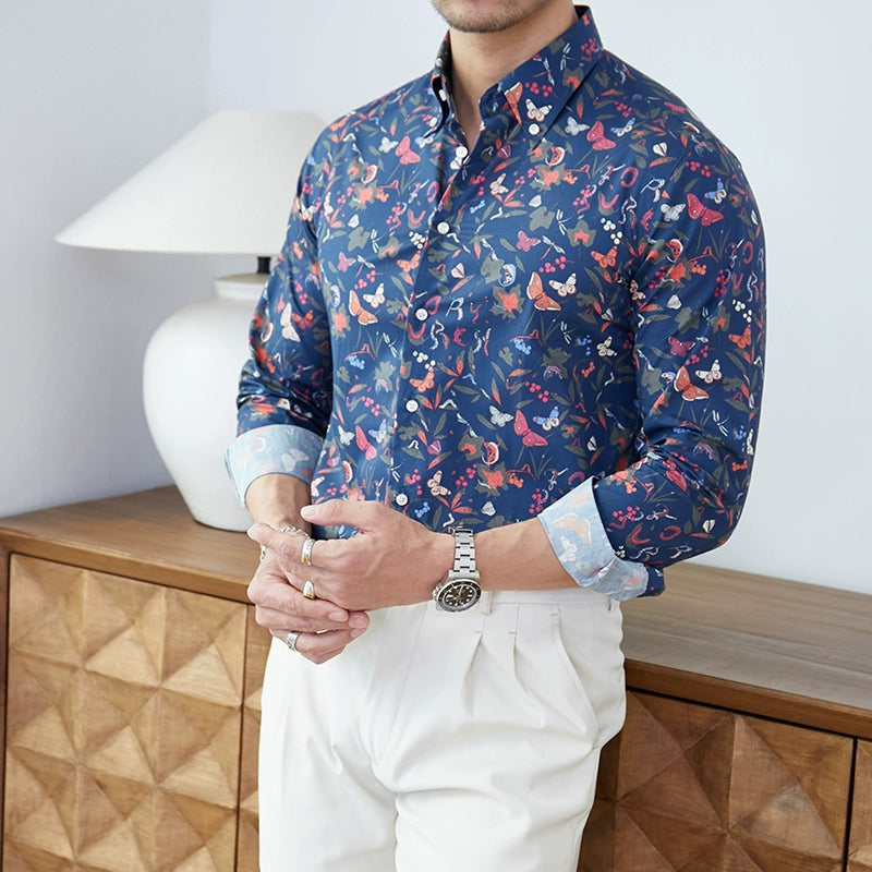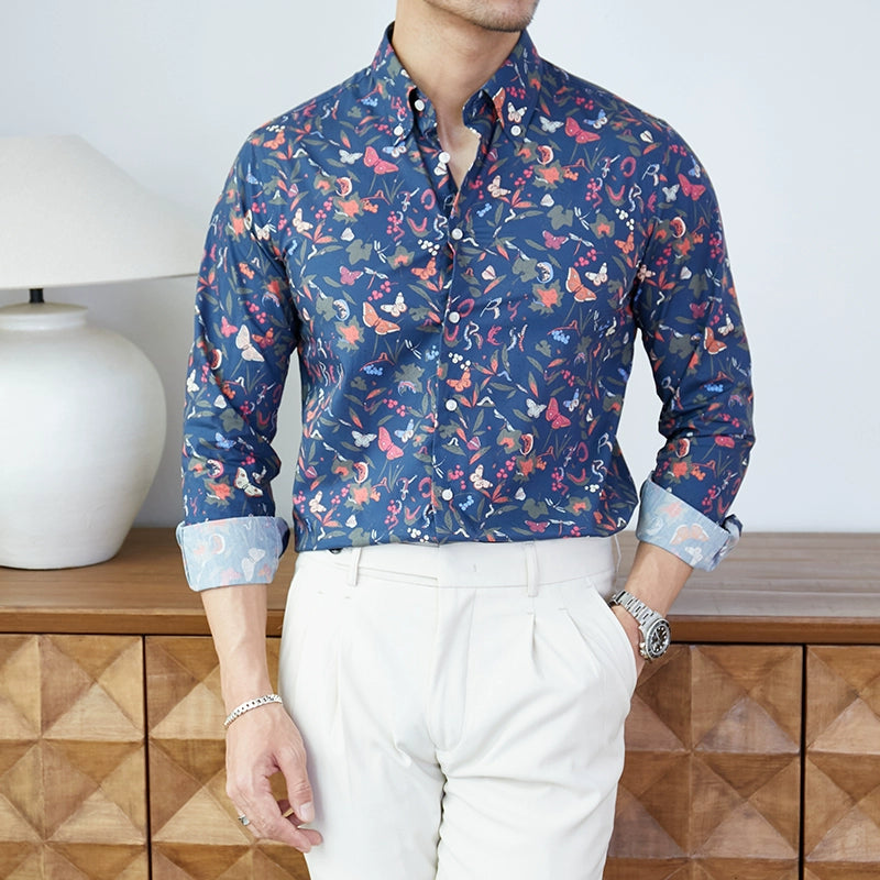 修身純棉男士渡假風休閒長袖襯衫藍底碎花新款