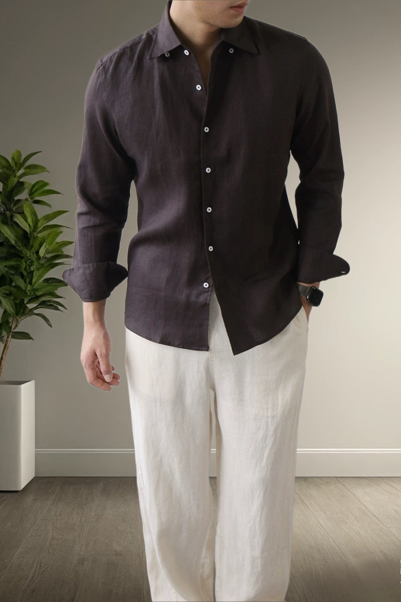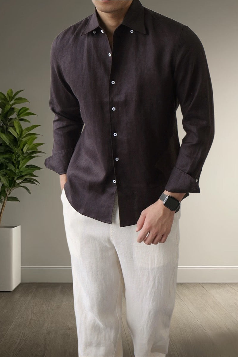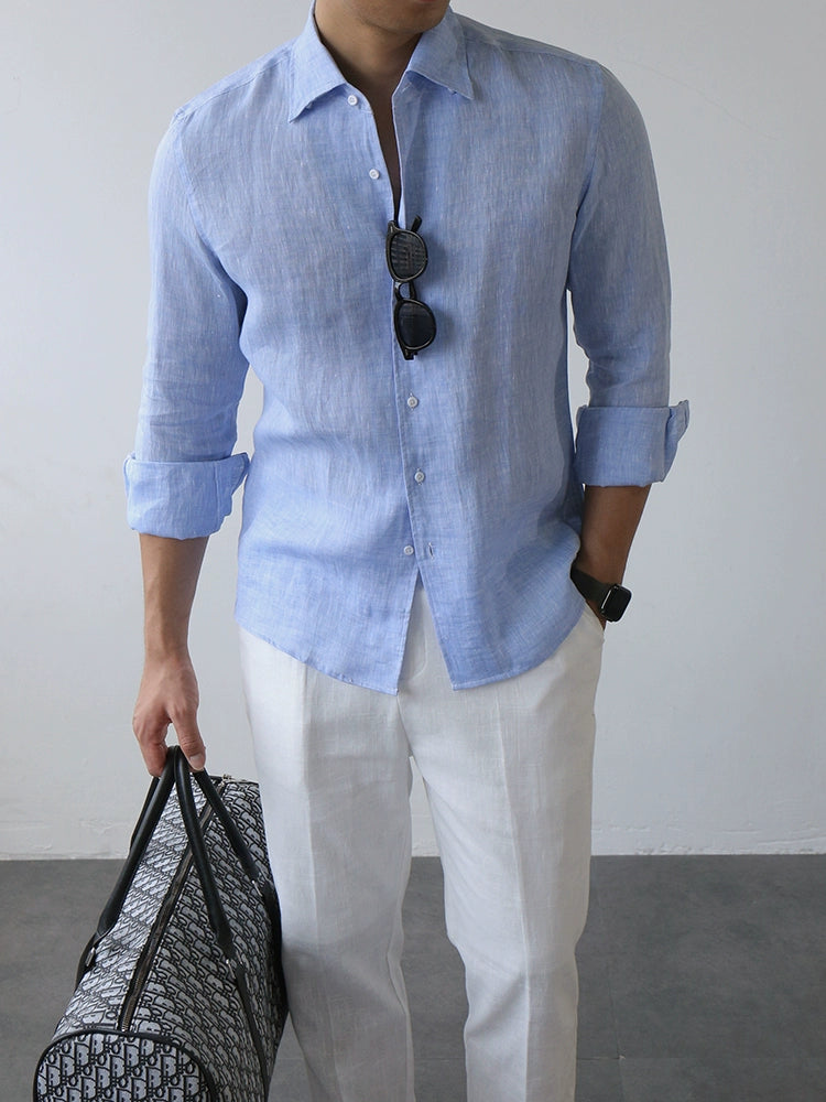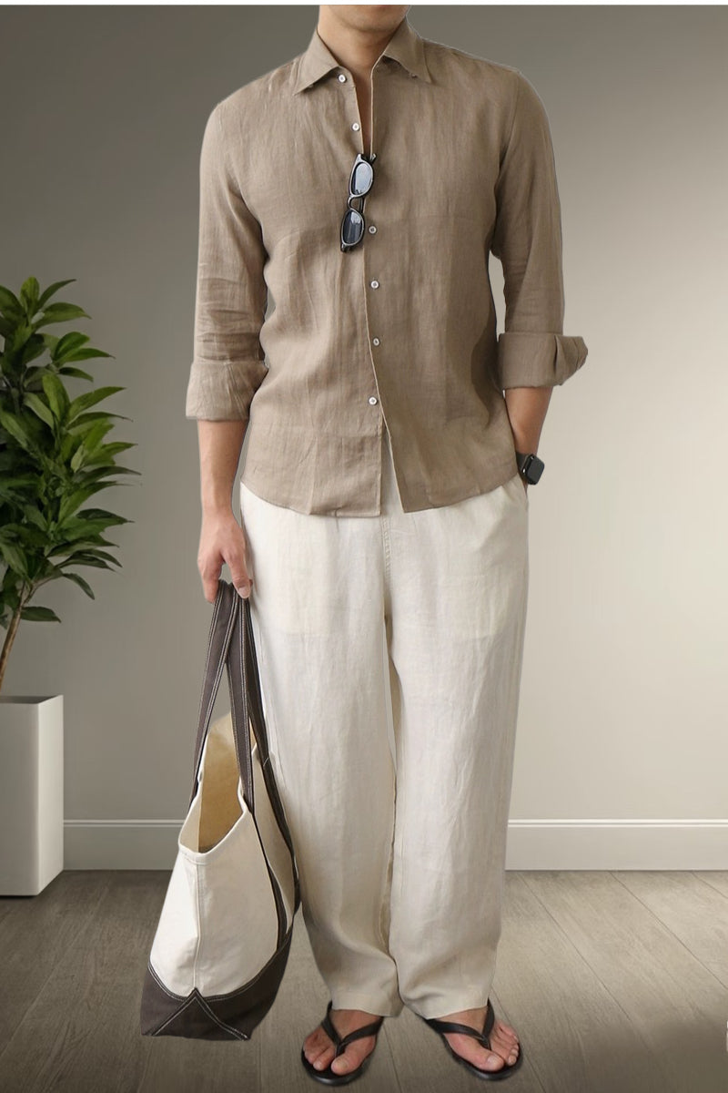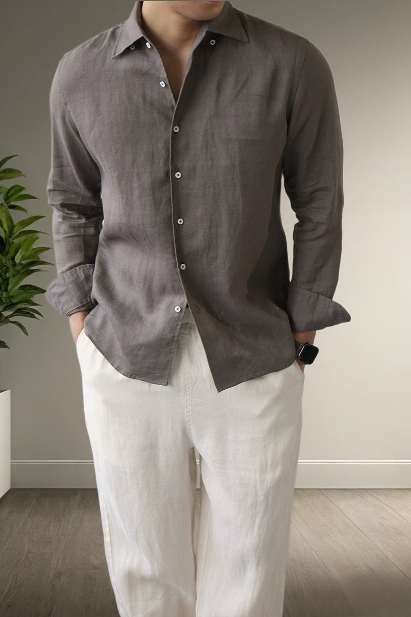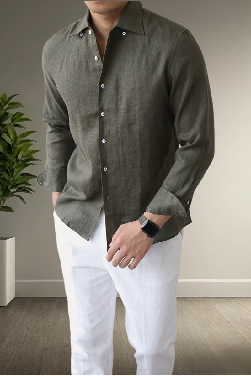 男士商務休閒透氣薄款一片領老錢風義式100%亞麻襯衫