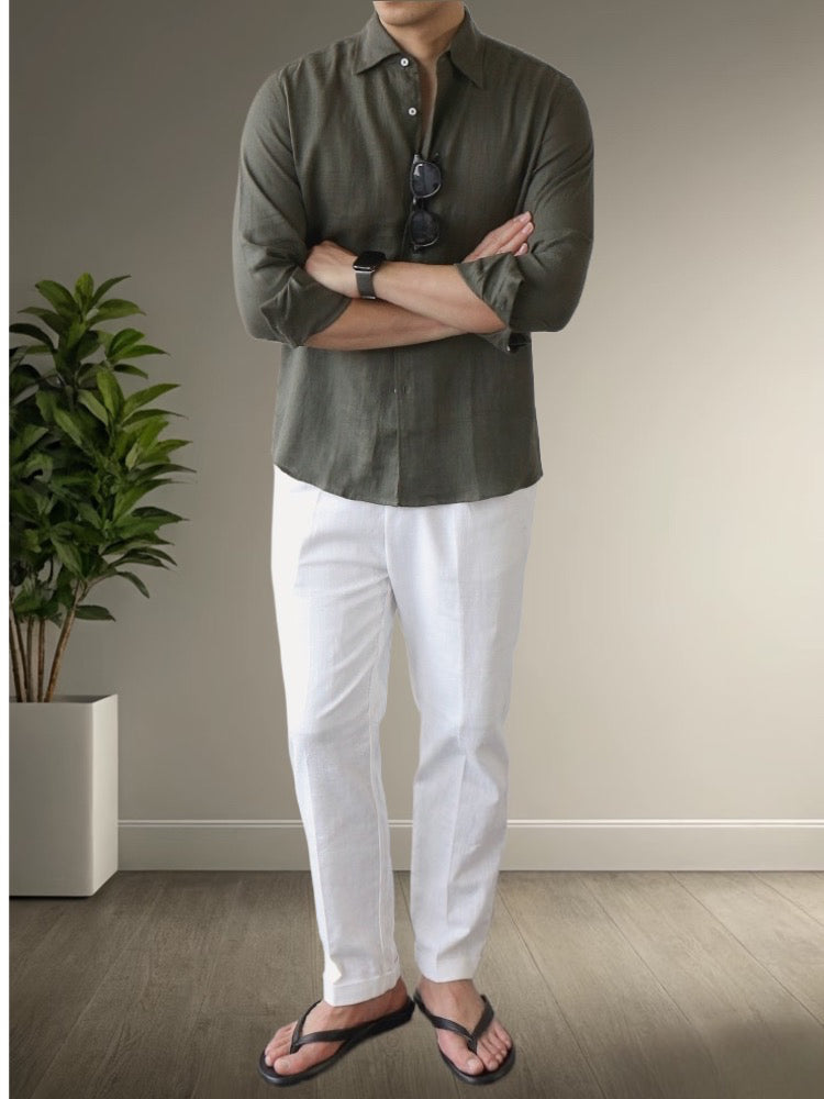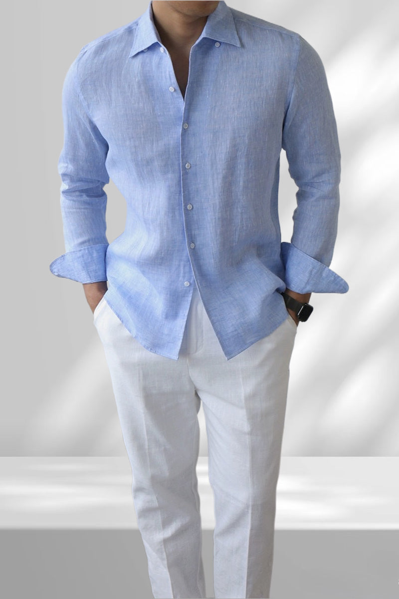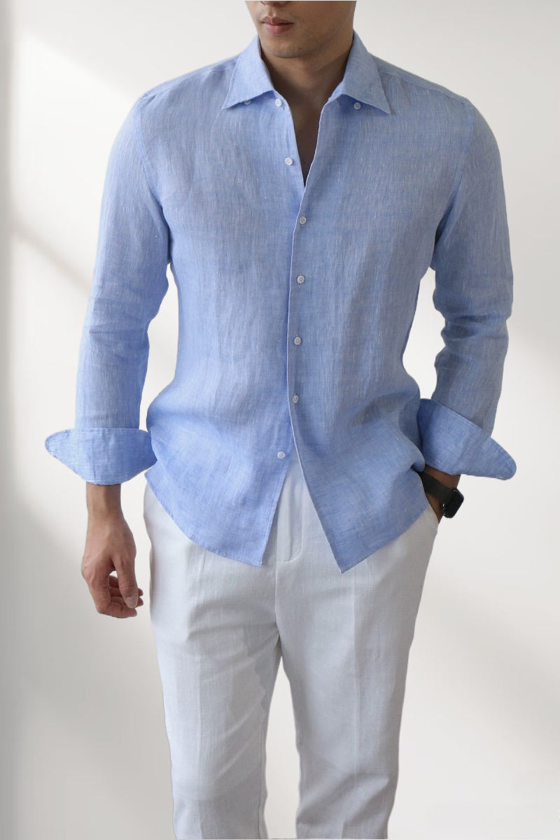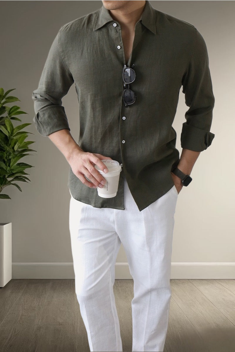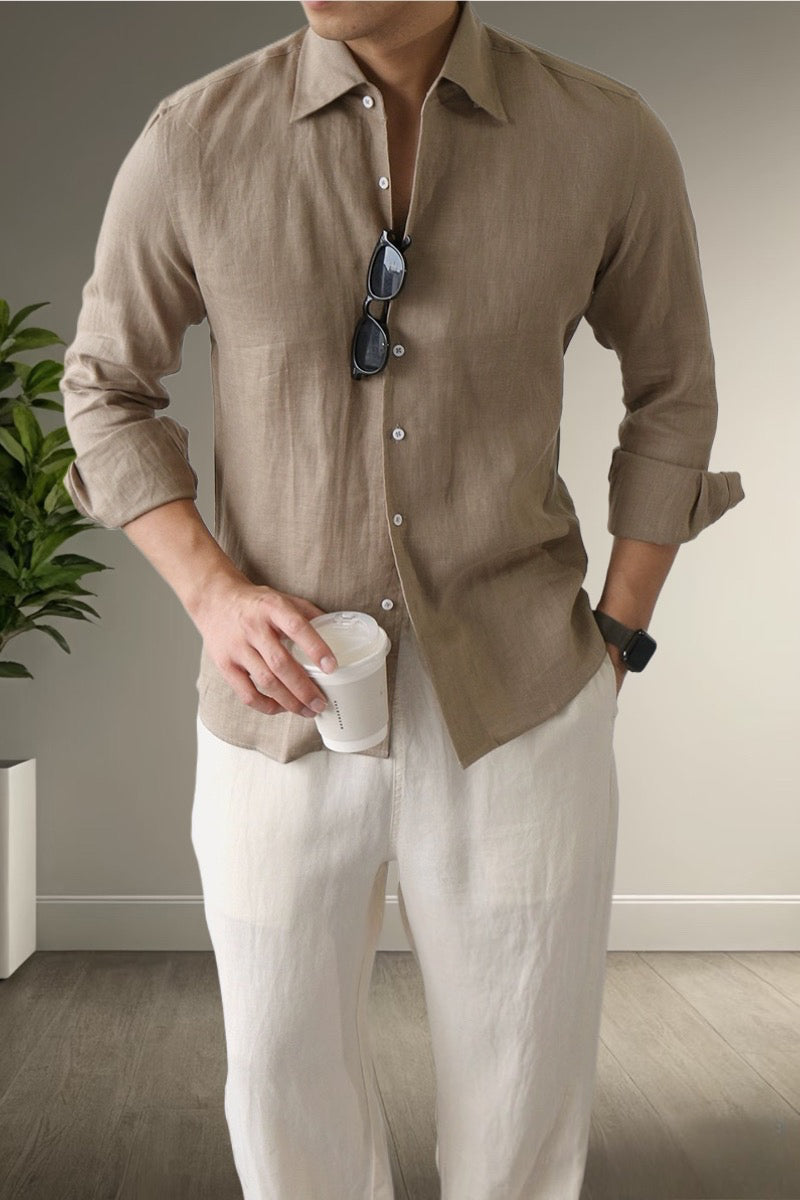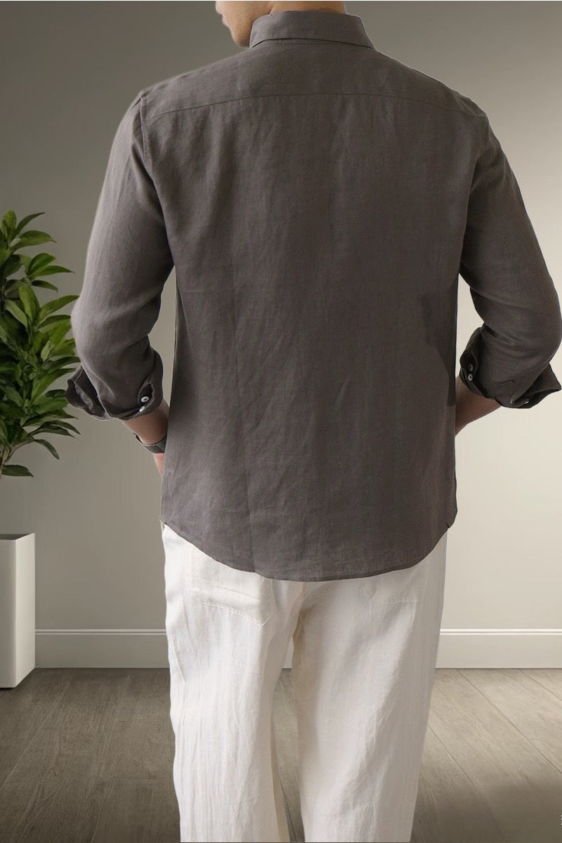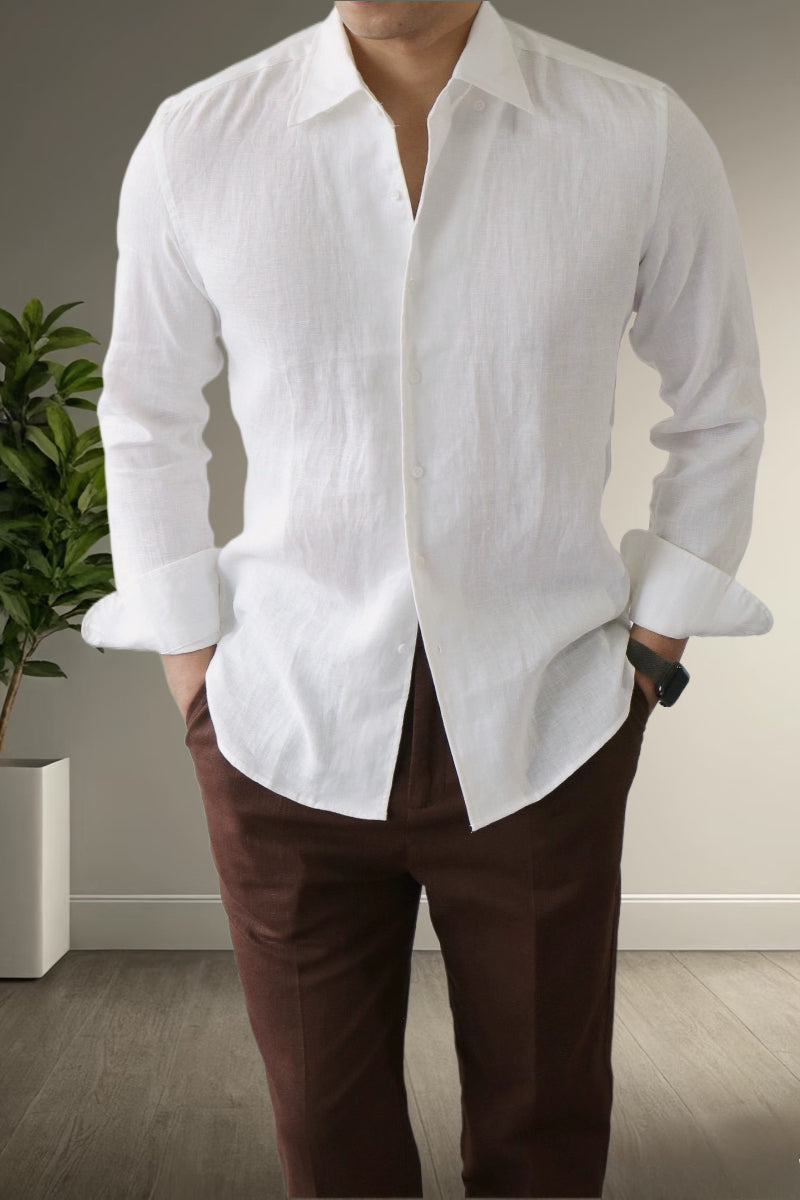 男士商務休閒透氣薄款一片領老錢風義式100%亞麻襯衫