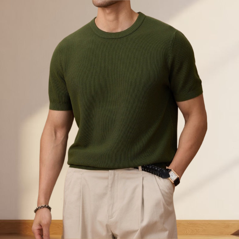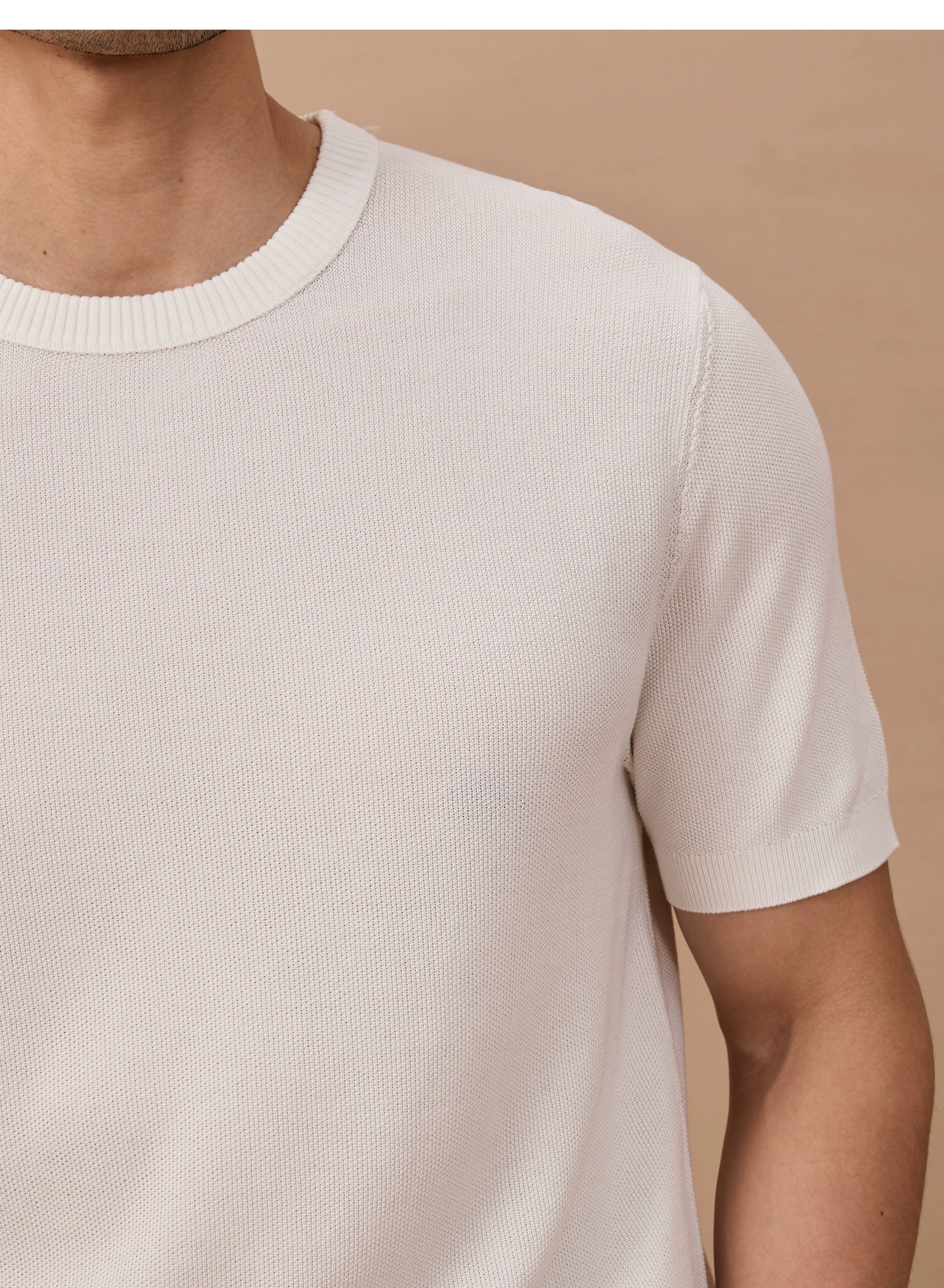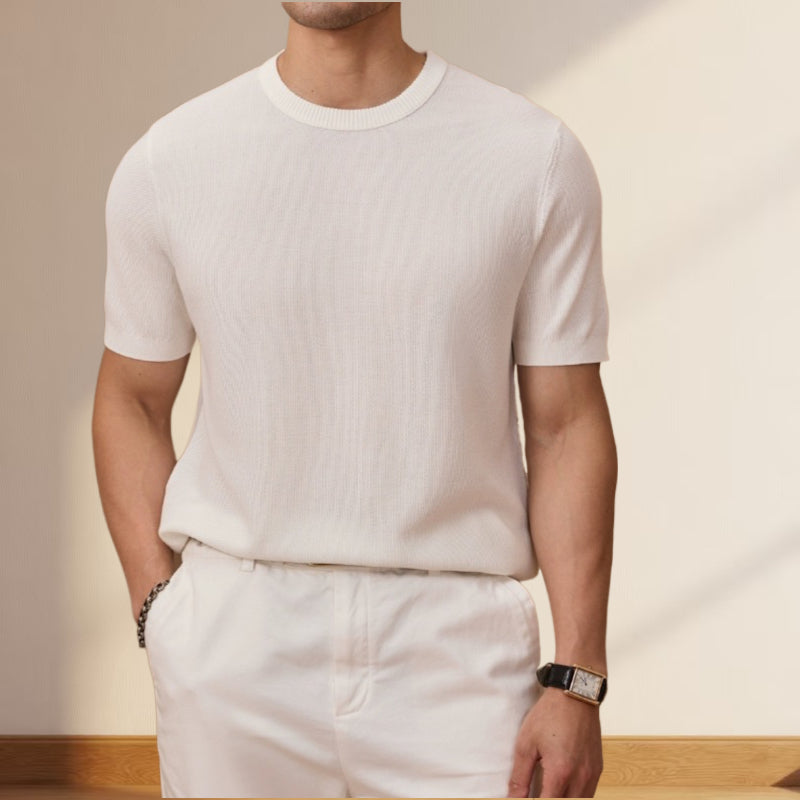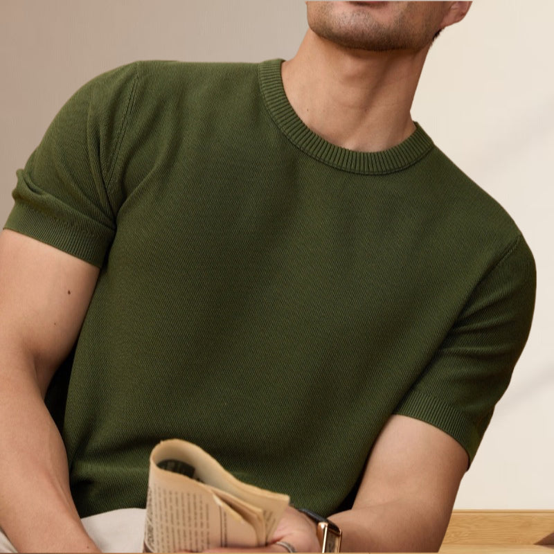 老錢風萊賽爾纖維針織短袖通勤義式復古純色圓領T恤男士